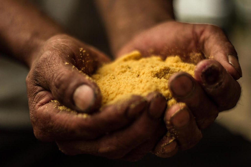 Finally, when little liquid remains, the mixture is boiled with great care to not burn the product, then transferred and stirred in a separate container until becoming deliciously golden and granular. The fibrous residues from the canes become combustible for the boiler, and other byproducts find use as fertilizers and food for farm animals, making full use of the plant.
